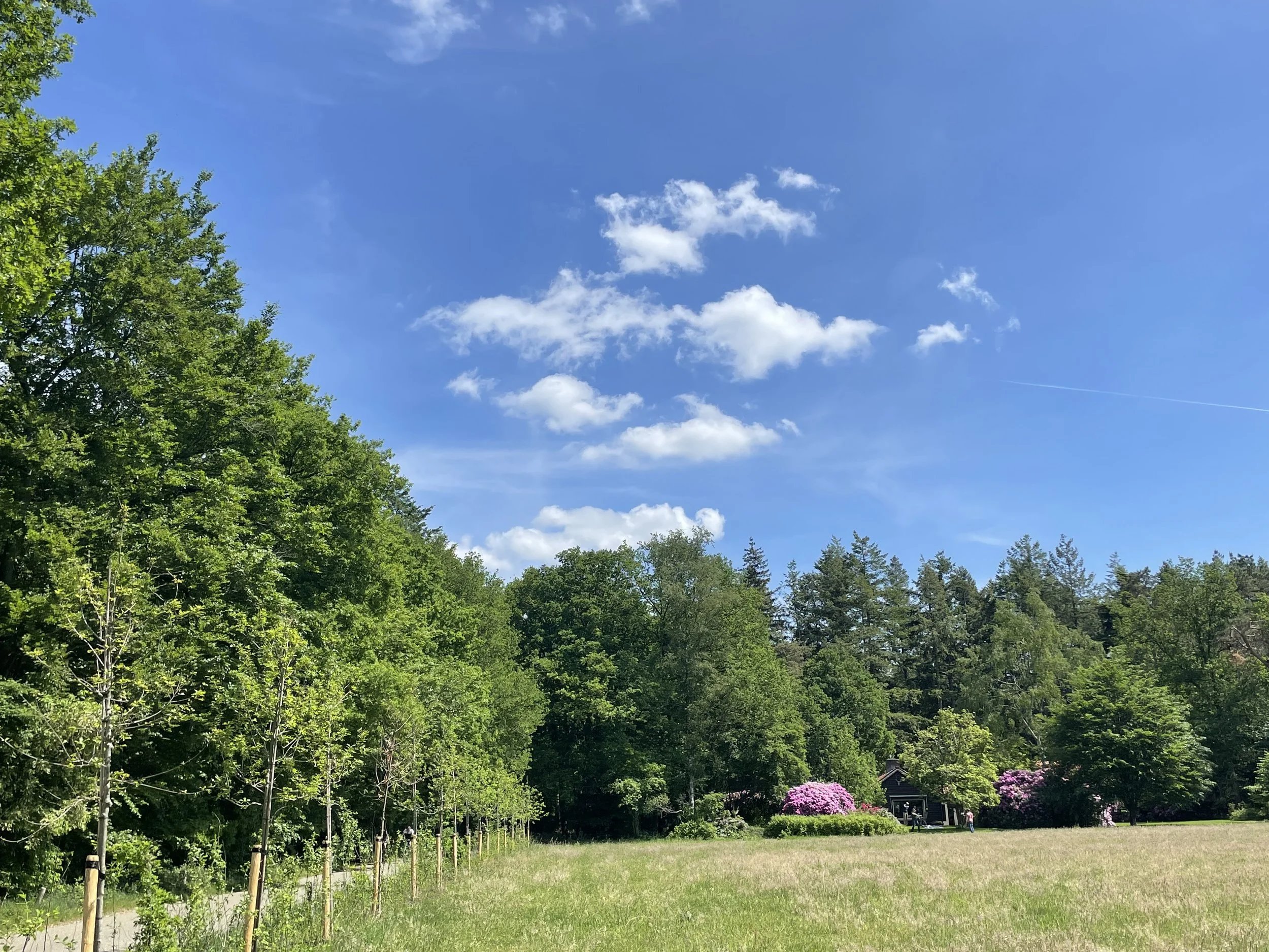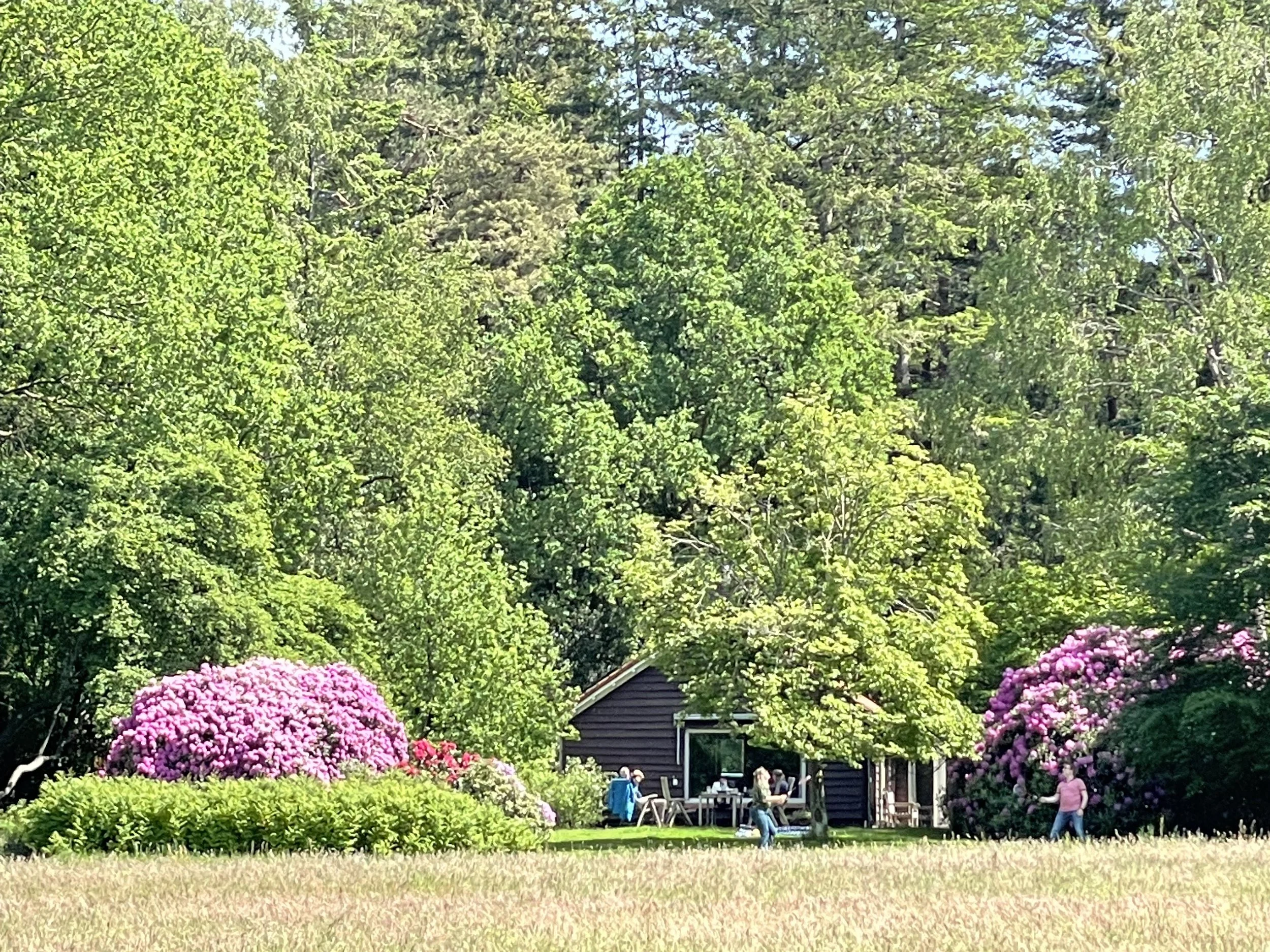 Vanuit de lichte woonkamer met houtkachel kijkt u uit over het naastgelegen veld. Door de openslaande deuren stapt u het terras op, omgeven door rhodondendrons. .